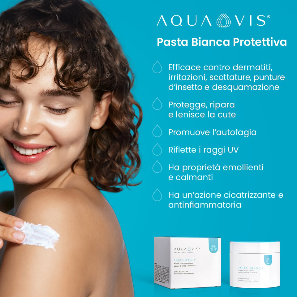 Con Aquavis®, Achillea, Calendula, Pantenolo, Allantoina, Bisabolo, Aloe Vera. Ossido di Zinco.